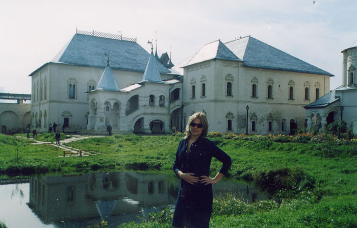 На фоне монастыря.